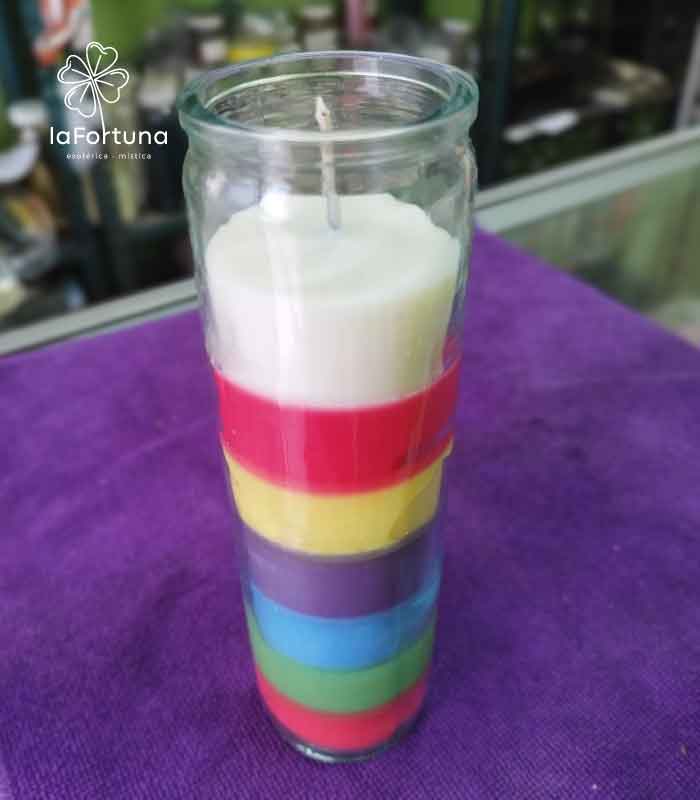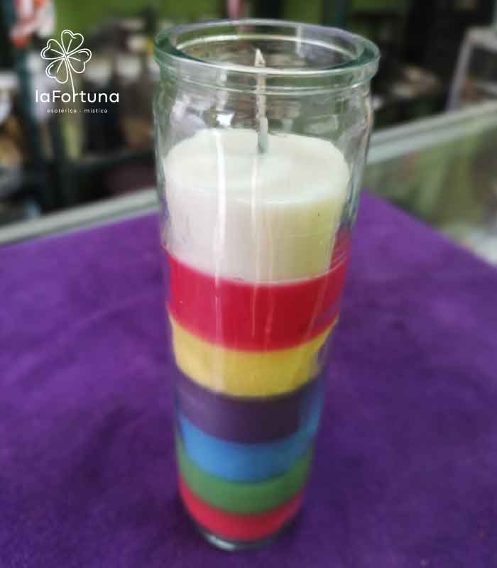 Cada uno de los siete colores que componen esta veladora ha sido intencionalmente seleccionado por su correspondencia con una energía y una esfera de influencia particular