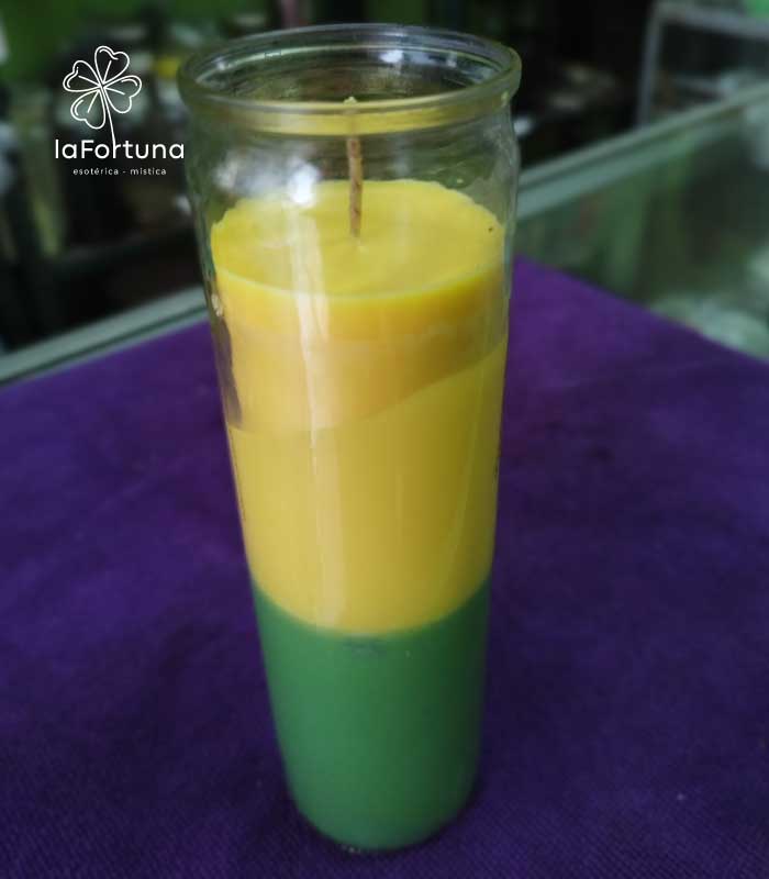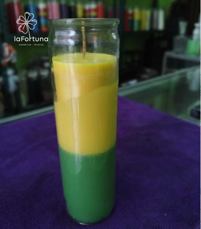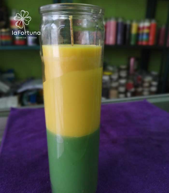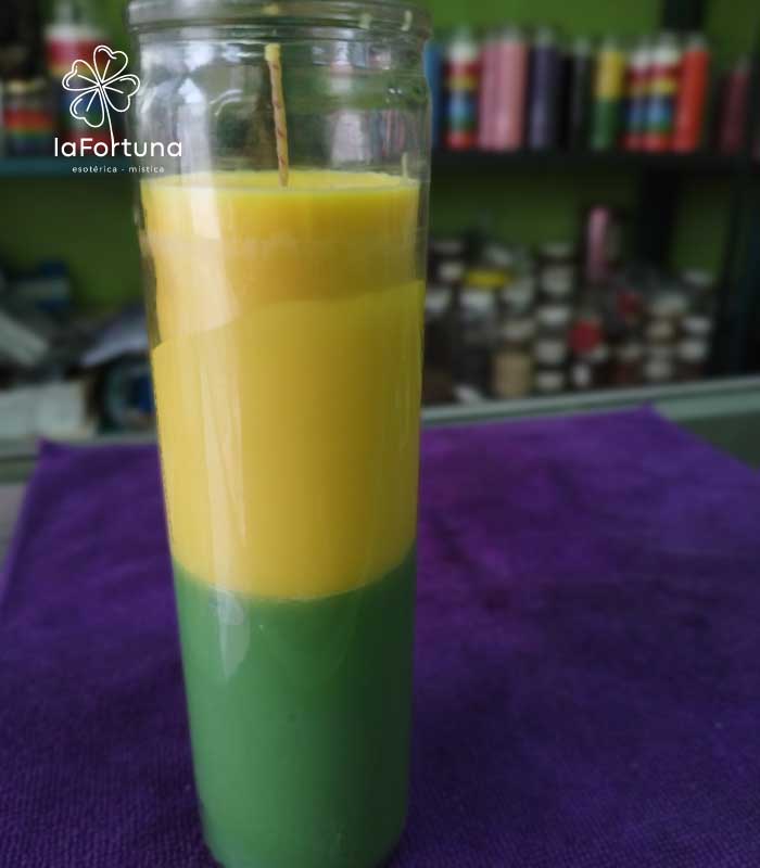 Despierta la sinergia de dos de las energías más potentes para el éxito material y el bienestar con nuestra Veladora Esotérica Bicolor Verde-Amarillo Vaso 100.